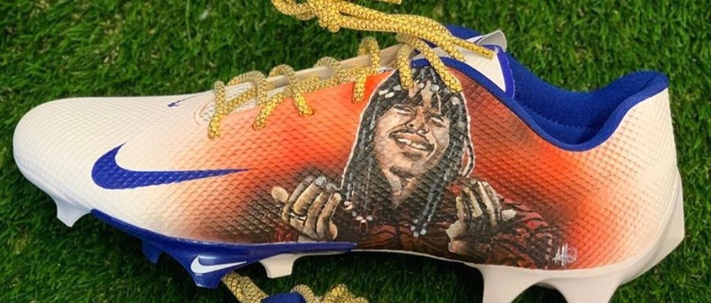 .@stefondiggs with custom Rick James cleats by @MACHE275