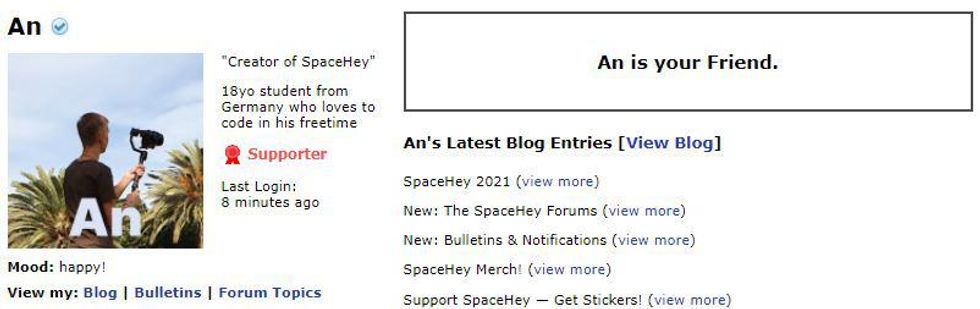 So An, an 18-year-old student from Germany, has replicated the old-school MySpace experience into a new social media platform called SpaceHey. if you join the site you will immediately become friends with An, much like you did with Tom back in 2006.