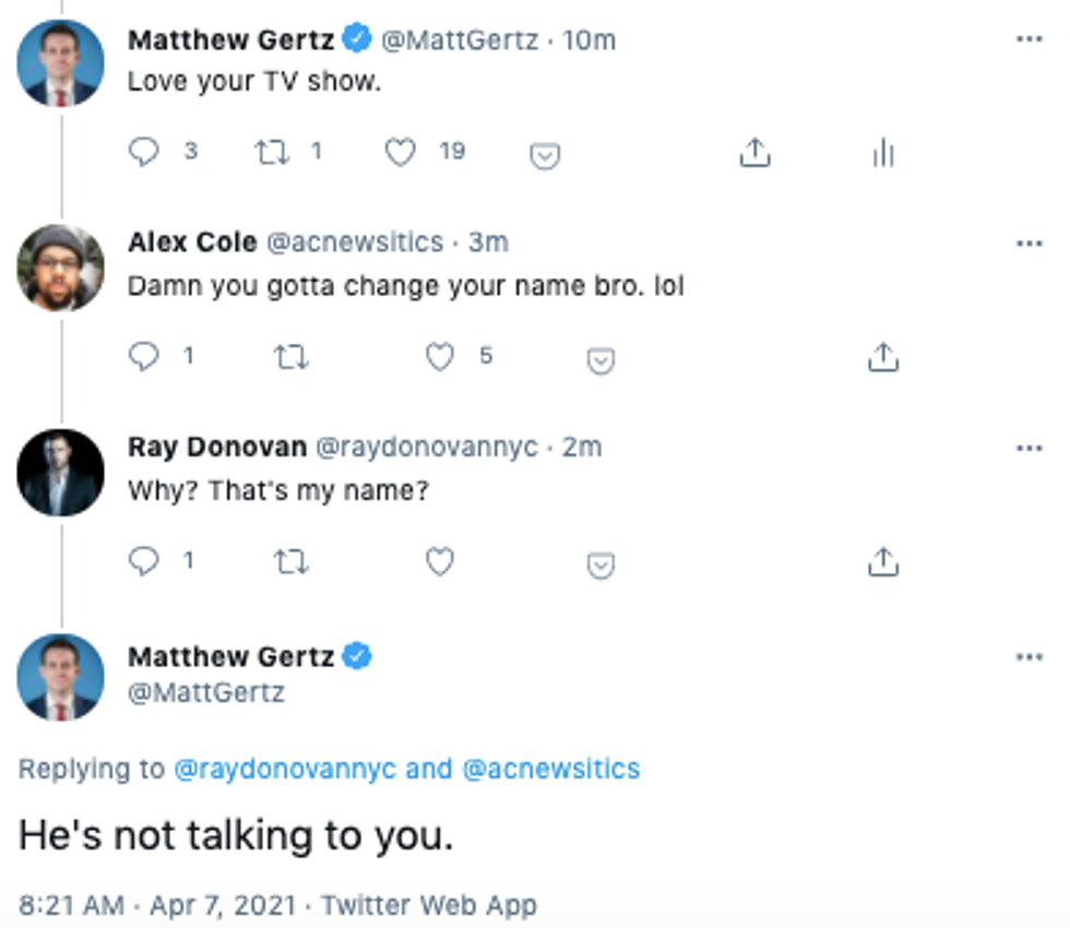 It’s hard to say whether it’s a spelling error that turns Gaetz to Gertz on Twitter or the fact that some people may think that Gaetz’s name is Gertz. But Twitter is a pretty confusing place in general.
