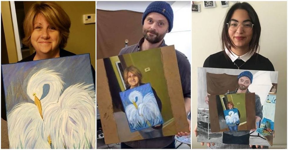 Then Reddit user Cacahahadoodoo asked the forum to take the post a step further. “Someone paint the photo of his mom holding her painting and repost it with the same title for extra extra karma,” they wrote.