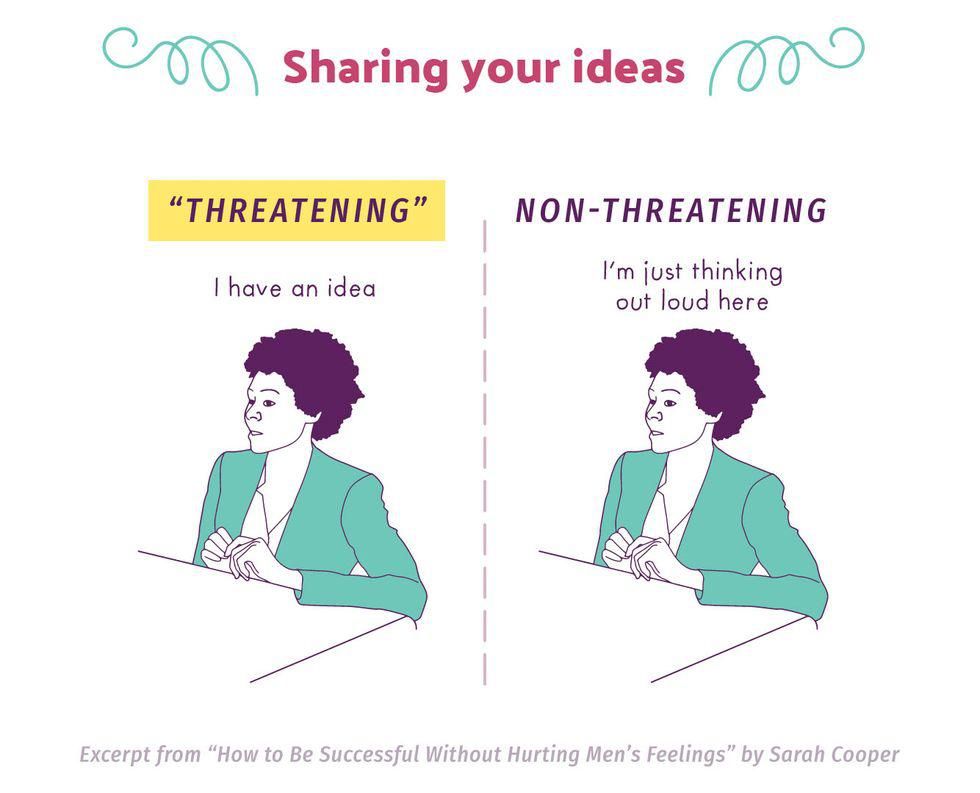 When sharing your ideas, overconfidence is a killer. You don’t want your male coworkers to think you’re getting all uppity. Instead, downplay your ideas as just “thinking out loud,” “throwing something out there,” or sharing something “dumb,” “random,” or “crazy.”