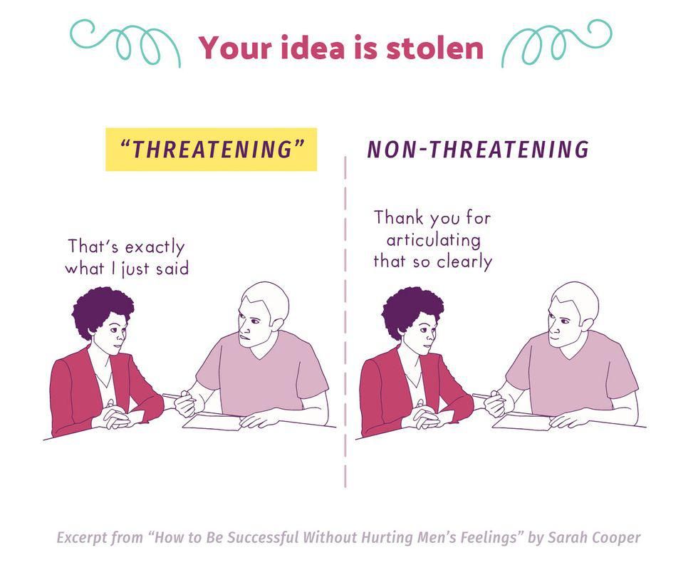 If a male coworker steals your idea in a meeting, thank him for it. Give him kudos for how he explained your idea so clearly. And let’s face it, no one might’ve ever heard it if he hadn’t repeated it.