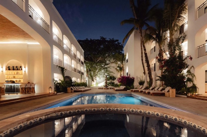 Twilight in the courtyard — tiled walkways, warm light on stucco, a last glass at Trópico — plus a couple’s massage on the wellness menu if you want the full exhale.