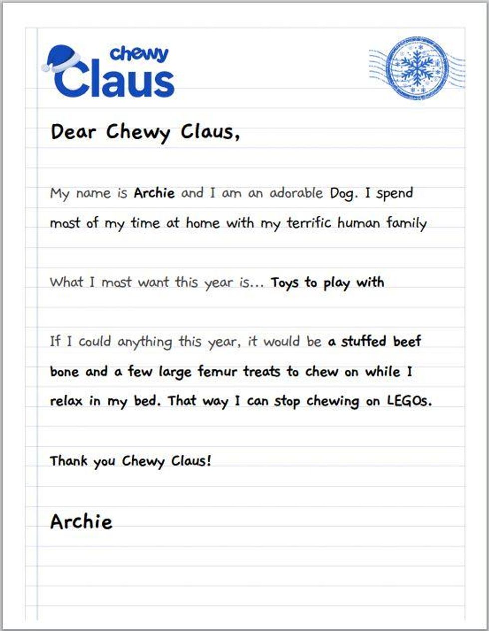Not only could your pet’s letter make their holidays even merrier, it will give back, too. For every letter submitted to Chewy Claus, Chewy will donate one pound of food to Greater Good Charities (up to 15,000 pounds). Further, for every product purchased during the Season of Giving, Chewy will match up to $1 million per week in a pet food and supply donation to Greater Good Charities, for a potential total of $10 million.
